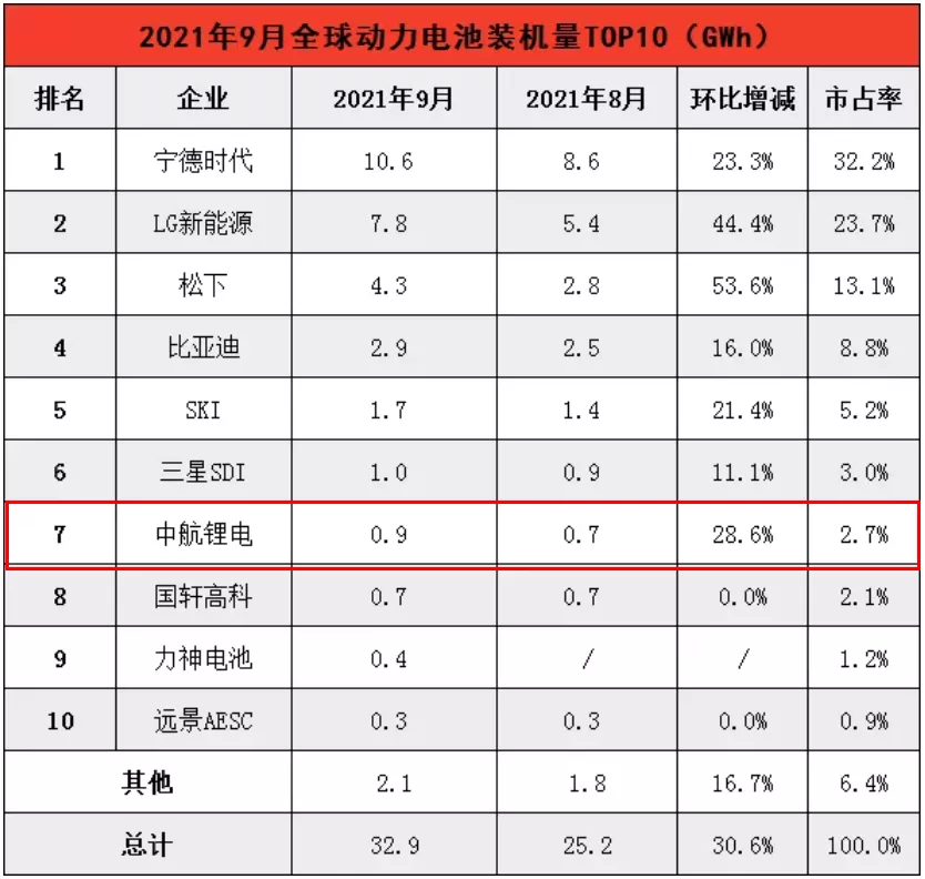 在10月底韩国市场研究机构SNE Research公布的2021年1-9月全球动力电池装车量排行榜中,中航锂电以5.6GWh的动力电池装车量,位居第七。