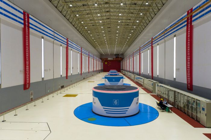 长龙山电站厂房内共布置6台35万千瓦抽水蓄能机组,根据电网调度指令,在用电高峰期发电调峰,在用电低谷期抽水填谷,单台机组每小时可抽水16万立方米,假如6台机组同抽,可以在8小时内将上水库从死水位抽至正常蓄水位,相当于为“充电宝”充进超过1260万度电。假如在用电高峰期6台机组齐发,长龙山电站可持续6个小时满发,每个小时输出电量210万千瓦时。
