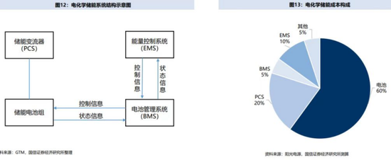 根据国信证券经济研究所测算,在电化学储能系统的成本构成中,电池占比约60%,储能变流器PCS占比约20%。此外,能量控制系统占比约10%,电池管理系统占比5%左右。