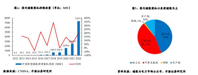 国内储能装机有望持续增长,表前储能为装机主力。根据CNESA数据统计,2012-2022年间国内新型储能新增装机复合增 速高达95%。2022年国内新型储能新增装机高达7.3GW,同比增长近200%。就国内储能装机类型分布而言,根据储能与 电力市场公众号统计,可再生能源配储与独立储能装机占比分别为45%与44%,用于调频的装机占比仅为1%,工商业用 户侧储能装机占比10%。我国当前的储能类型主要还是以用于配套新能源装机的表前储能装机为主。