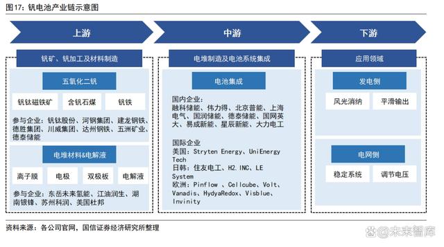 电堆降本的主要手段:1)通过优化电极材料性能等方式,提升电堆功率密度;2)优化电堆组装工艺,如依托激光焊接技术将离子膜与电极框直接密封、减少密封垫使用来降低成本。 目前钒电池系统企业多进行电堆自产。钒电池系统主要由电堆、电解液、储液罐、电池管理系统、逆变器等组成;电解液和电堆是核心构件。电池管理系统、逆变器等产品多由锂电储能产业链中相关企业直接提供。因此,国内目前多数钒液流电池企业在产业化初期,多采用电堆自产的方式来控制成本和优化功率性能。目前国内领先的电堆生产企业包括融科储能、北京普能、上海电气等。
