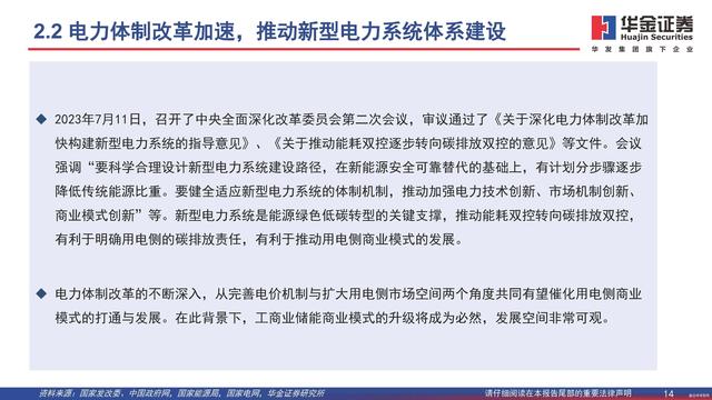 2023年7月11日,召开了中央全面深化改革委员会第二次会议,审议通过了《关于深化电力体制改革加快构建新型电力系统的指导意见》、《关于推动能耗双控逐步转向碳排放双控的意见》等文件。会议强调“要科学合理设计新型电力系统建设路径,在新能源安全可靠替代的基础上,有计划分步骤逐步降低传统能源比重。要健全适应新型电力系统的体制机制,推动加强电力技术创新、市场机制创新、商业模式创新”等。新型电力系统是能源绿色低碳转型的关键支撑,推动能耗双控转向碳排放双控,有利于明确用电侧的碳排放责任,有利于推动用电侧商业模式的发展。