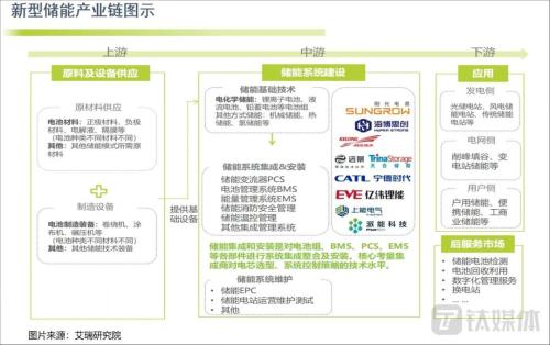 根据艾瑞研究院的梳理,储能产业链的上游主要是电池材料的原材料供应商和制造商;中游则是系统建设环节,包括基础技术、系统集成安装和系统运维三大部分,市场中最知名的宁德时代、亿锂纬能、阳光电源、天合光能等都处于中游;下游则是发电侧、电网侧、用户侧的应用及服务。