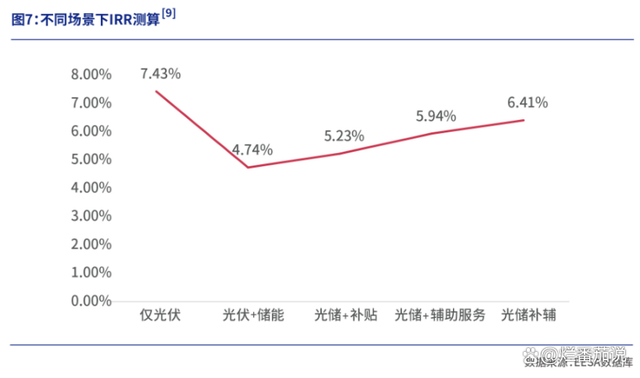 以内蒙古某100MW光伏发电项目、配套20MW/40MWh储能电站为例,在仅光伏发电的情景下,内部收益率高达7.43%,光伏+储能的情景下,内部收益率降至4.74%,而如果是光伏+储能+补贴的情景下,内部收益率可达5.23%;“光伏+储能+辅助服务”内部收益率可达5.94%;“光伏+储能+补贴+辅助服务”,内部收益率更是高至6.41%。