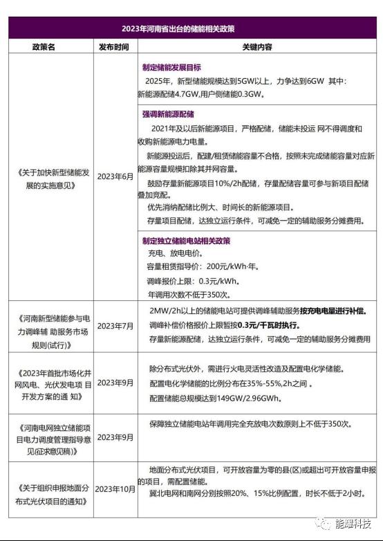 为推动河南储能项目的开展,2023年,河南省密集出台多项政策推动储能发展,涉及电力调峰辅助服务、新能源配储、独立储能容量租赁及调用次数等多方面。