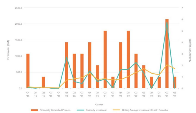 在今年第二季度,包括Waratah Super Battery电池储能项目在内的六个大型电池储能系统获得投资承诺,首次在一个季度内突破10亿澳元大关。而在今年第三季度,只有一个储能项目获得投资,是一个在采矿场部署的太阳能+储能混合项目。