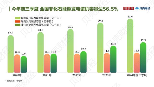 中国电力企业联合会统计数据显示,截至2024年9月底,全国全口径发电装机容量31.6亿千瓦,煤电占总发电装机容量的比重为37.3%,同比降低4.4个百分点;非化石能源发电装机容量17.9亿千瓦,同比增长24.0%,占总装机容量比重为56.5%,比上年同期提高4.5个百分点。这表明中国能源结构持续优化,清洁能源在总装机中的重力提升,为实现“双碳”目标奠定了基础。