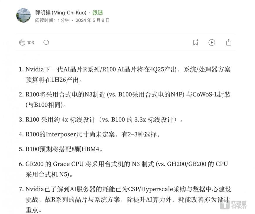 天风国际证券分析师郭明錤指出,英伟达下一代R系列/R100 AI芯片将于2025年第四季度量产,采用台积电3nm制程、4个reticle设计,搭配8颗HBM4,重点改善能耗。最早在明年,R100 AI GPU就将登场。