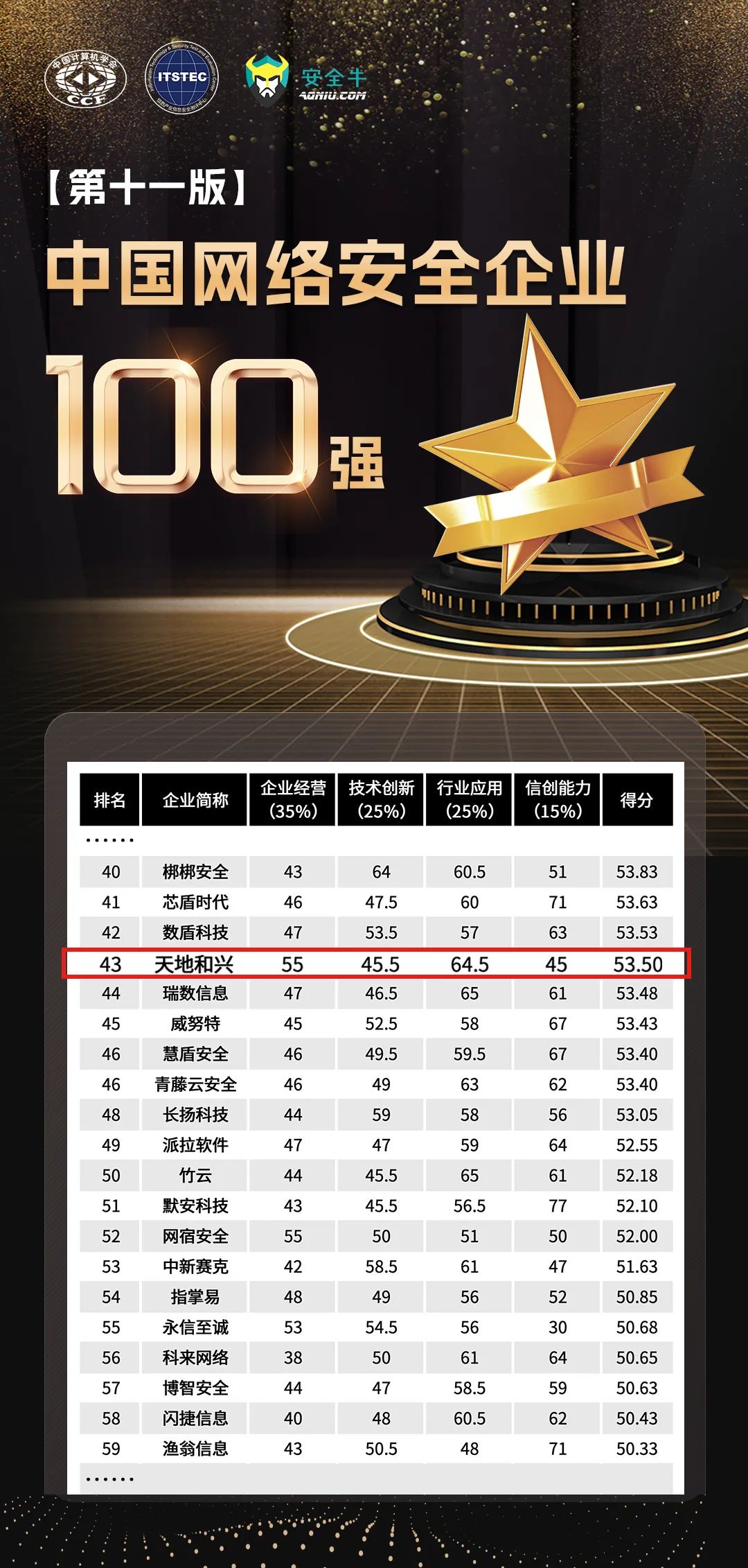 近日,由中国计算机学会抗恶劣环境计算机专业委员会、信息产业信息安全测评中心、安全牛联合发起的第十一版《中国网络安全企业100强》正式发布。天地和兴凭借在工业网络安全领域多年的深耕及亮眼成绩,从300余家安全厂商中脱颖而出,连续五年上榜“中国网络安全企业100强”。