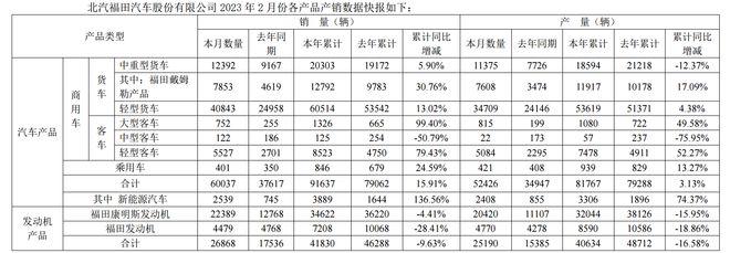3月6日,福田汽车发布2023年2月产销数据快报称,2月销售汽车60037辆,高于2022年同期的37617辆。2月新能源汽车售出2539辆,高于2022年同期的745辆,同比增加136.56%。