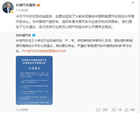 “今天下午的交流收益颇多,也更加坚定了大家共同推动中国新能源汽车测试水平提升的决心。为中国用户造好车、选好车是中国汽车行业各方的共同使命。”12月14日,长城汽车总裁穆峰在其个人社交平台表示,“我们提出了七大倡议,全力支持行业各方以用户利益为中心开展专业测试。”