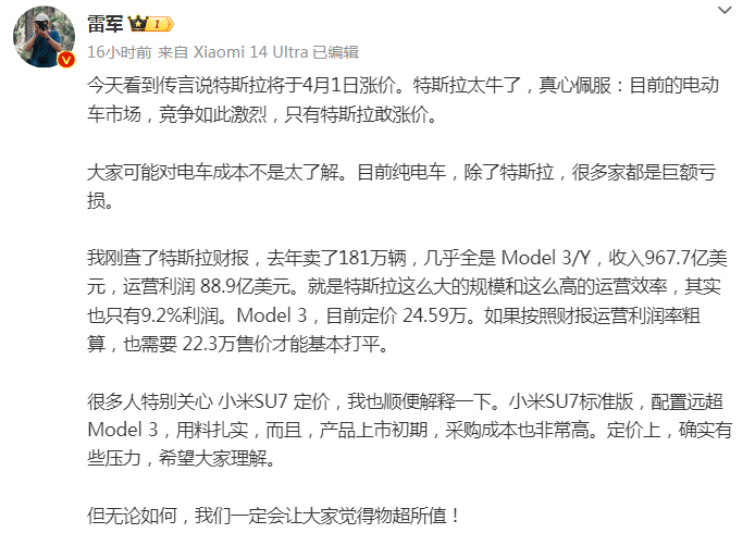 雷军还提到了小米SU7的定价,他表示:“小米SU7标准版,配置远超 Model 3,用料扎实,而且,产品上市初期,采购成本也非常高。定价上,确实有些压力,希望大家理解。”