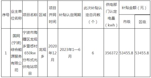 根据《宁波市家庭屋顶光伏补贴专项资金管理暂行办法》(甬发改能源〔2018〕36号)、《海曙区节能降耗专项资金管理办法》(海发改〔2019〕36号)等文件精神,海曙区2023年上半年符合非自然人家庭屋顶光伏发电补贴项目共1个,总并网容量650kw,2023年上半年补贴发电周期为2023年1月1日至2023年6月30日,合计发电量356372千瓦时,需拨付补贴资金106911.6元(其中:市级补贴资金53455.8元,区级配套补助资金53455.8元)。