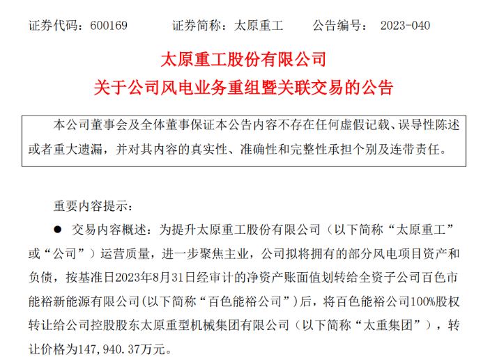 公告披露,太原重工拟将拥有的部分风电项目资产和负债,按基准日2023年8月31日经审计的净资产账面值划转给全资子公司百色市能裕新能源有限公司(以下简称“百色能裕公司”)后,将百色能裕公司100%股权转让给公司控股股东太原重型机械集团有限公司(以下简称“太重集团”),转让价格为147,940.37万元。