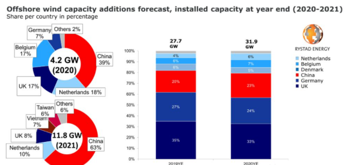 根据知名能源咨询公司Rystad Energy数据统计,尽管受新冠疫情影响,2020年全球海上风电新增装机4.2GW,同比增长15%,总装机达到31.9GW。同时,该机构预测今年全球将新增装机11.8GW,同比增长37%,最终装机达到43.7GW。