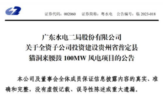 2月10日晚间,广东水电二局股份有限公司(一下简称“粤水电”或“公司”)发布《关于全资子公司投资建设贵州省普定县猫洞来腰鼓 100MW 风电项目的公告》。