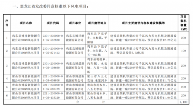 公告披露,宁夏嘉泽新能源股份有限公司下属公司于日前收到了黑龙江省发展和改革委员会(以下简称“黑龙江省发改委”)出具的风电项目核准的批复文件,共计六个风电项目获得核准,总装机容量为1100MW。