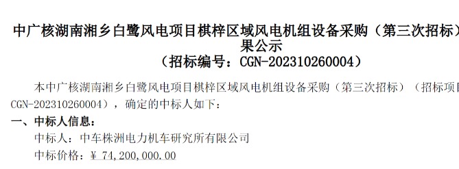 1月2日,中广核电子商务平台发布《中广核湖南湘乡白鹭风电项目棋梓区域风电机组设备采购(第三次招标)中标结果公示》的公告。