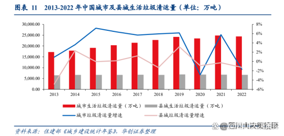 量为 2.44 亿吨,并连续两年超过 2019 年受影响前的 2.42 亿吨,疫情对生活垃圾清运量的负向影响得到缓解。近 10 年我国乡村生活垃圾处理率不断提高,根据《2022 城乡建设统计年鉴》,农村地区生活垃圾处理率已达 82.99%。相比城市而言,农村的垃圾产生规模和人均垃圾产生量远远偏低,同时存在乡村人口萎缩的情况,但由于农村地区垃圾收集、处置率存在较大的提高空间,依靠对未处理的垃圾存量的消化和扩大处理覆盖,未来农村垃圾处理规模的扩张可期。