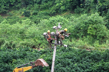 6月9日上午,国网江永县供电公司抢修工作人员在10千伏桃粗线大泊水矿山分支线4号杆紧张有序地抢修因洪水造成的线路故障,该公司主要负责人来到现场,语重心长地反复叮嘱现场工作人员要在确保安全的前提下,有条不紊推进抢修复电工作,要跟时间赛跑、跟天气赛跑,在第一时间内恢复供电,为群众们防汛抗洪提供电力保障。经过六个小时的紧张奋战,工作人员安全顺利恢复了该条线路的供电。