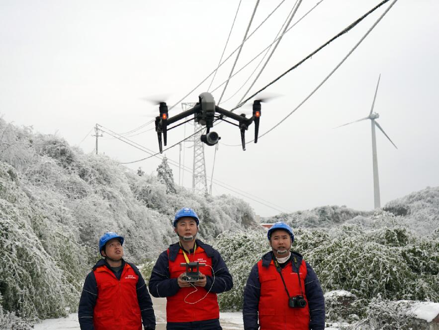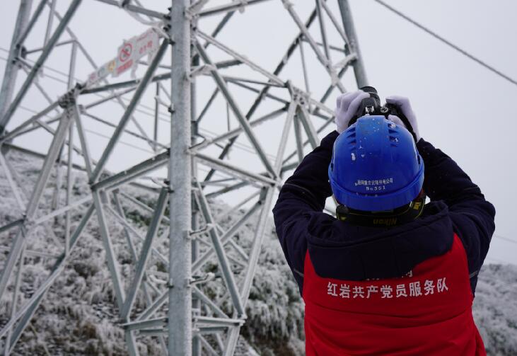 中国电力网讯 “110千伏四黎线今日最大覆冰厚度7.9毫米,目前风速3.5米每秒,温度零下4度……”“小心一点,要走两边有草丛的地方,中间的道路结冰了,容易滑倒。”1月9日,国网重庆武隆供电公司输电运维检修班成员吴鼎、赵楼等人来到武隆区和顺镇四眼坪乡对覆冰线路开展特殊巡视。在白雪皑皑的四眼坪,国家电网红岩共产党员服务队队服的颜色成了冰雪世界里最靓丽的一抹红,他们手拿着无人机、砍刀、绳索、望远镜、风速仪等设备再一次踏入他们熟悉的“冰雪战场”。