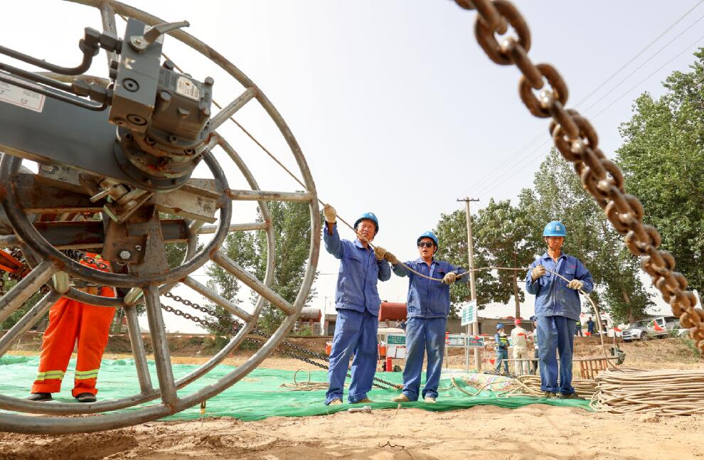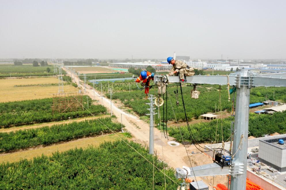 近日,河北省石家庄晋州市气温持续攀升,在河北石家庄晋州园区110千伏输变电线路工程施工现场,国网石家庄供电公司的50多名施工人员正在有条不紊地开展张力放线施工作业。