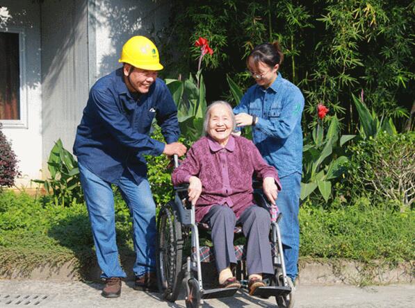 枫桥供电所员工陈仲立、许莹到诸暨枫桥敬老院看望老人并聊家常