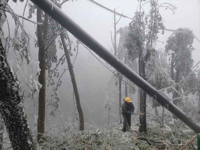 为确保景区供电需求和游客安全,该公司组织30余名党员干部职工兵分三路,一边紧急调集大功率发电机抬运至景区,第一时间保障该线路用户可靠供电,一边协同云阳国家森林管理局、茶陵县消防救援大队紧急开展道路疏通抢险,一边穿冰帘扫障碍,为抢修断杆线路做准备。到处是冰碴断枝的山林里,不断有晶莹剔透的冰块从树上掉落,抢修人员一边用柴刀对树枝进行清理,一边爬冰卧雪艰难前行,清理道路,运送杆线抢修物资,在零下冰冻的高山上,分秒必争地投入到抢修中。