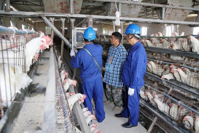 国网达州城区供电公司碑庙供电所工作人员正在兴凤养殖合作社鸡场内检查线路。国网达州城区供电公司供图