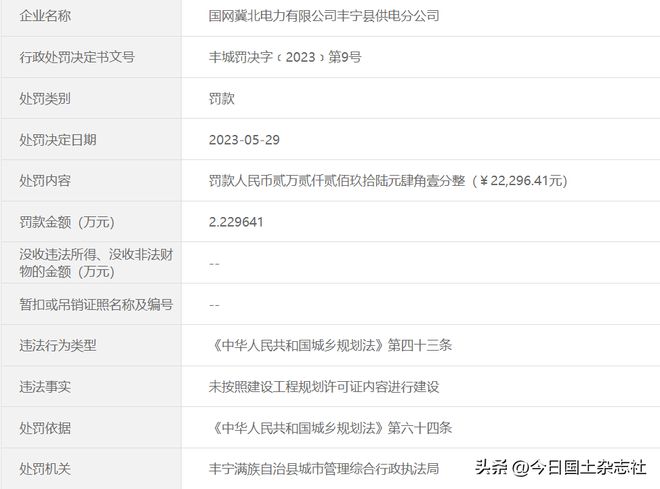 据河北省承德市丰宁满族自治县城市管理综合行政执法局5月29日公布的“丰城罚决字﹝2023﹞第9号”行政处罚信息显示,国网冀北电力有限公司丰宁县供电分公司因未按照建设工程规划许可证内容进行建设,被处以罚款2.229641万元。