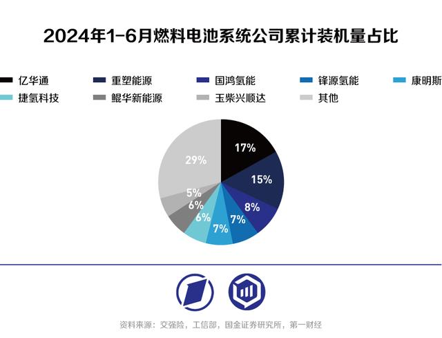 但燃料电池系统供应商的竞争格局仍在不断变化中。2024年1-6月,国内燃料电池系统公司累计装机量排名,亿华通作为龙头继续保持第一,2-6名分别为重塑能源、国鸿氢能、锋源氢能、康明斯、捷氢科技,而2023年2-6名分别为捷氢科技、重塑能源、国鸿氢能、潍柴动力、未势能源。