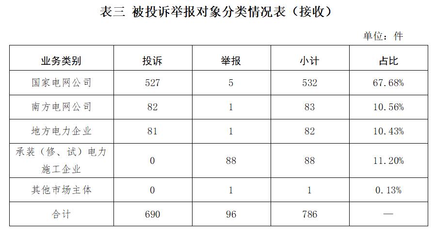 从被投诉举报对象看,供电企业530件、占投诉举报总数的83.07%,其中国家电网公司396件、占投诉举报总数的62.07%,南方电网公司60件、占投诉举报总数的9.40%,地方电力企业74件、占投诉举报总数的11.60%;承装(修、试)电力施工企业108件、占投诉举报总数的16.93%。