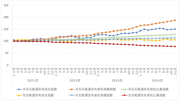 2024年11月,非化石能源发电综合指数为150.8,比2020年基期增长了50.8%,同比增长11.5%;其中,新能源发电综合指数为211.1,比2020年基期增长了111.1%,同比增长17.1%。在“双碳”目标引领下,非化石能源及其新能源发电综合指数保持快速增长态势。其中: