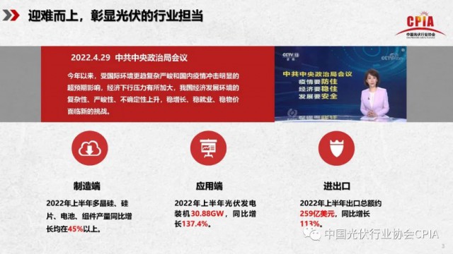 2022年7月21日,由中国光伏行业协会主办的“光伏行业2022年上半年发展回顾与下半年形势展望研讨会”采用线上直播形式顺利召开。中国光伏行业协会名誉理事长王勃华出席会议并作“2022年光伏行业上半年发展回顾与下半年形势展望”报告。