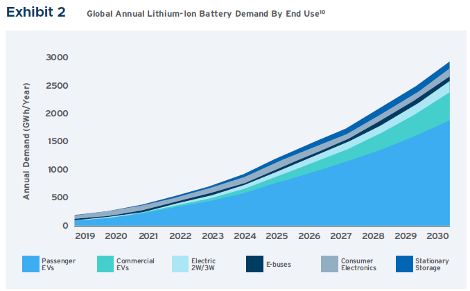 根据RMI公司的研究和彭博新能源财经公司的分析,到2030年,全球对锂离子电池的需求预计将达到每年2.8TW。其中大部分将满足电动汽车需求。