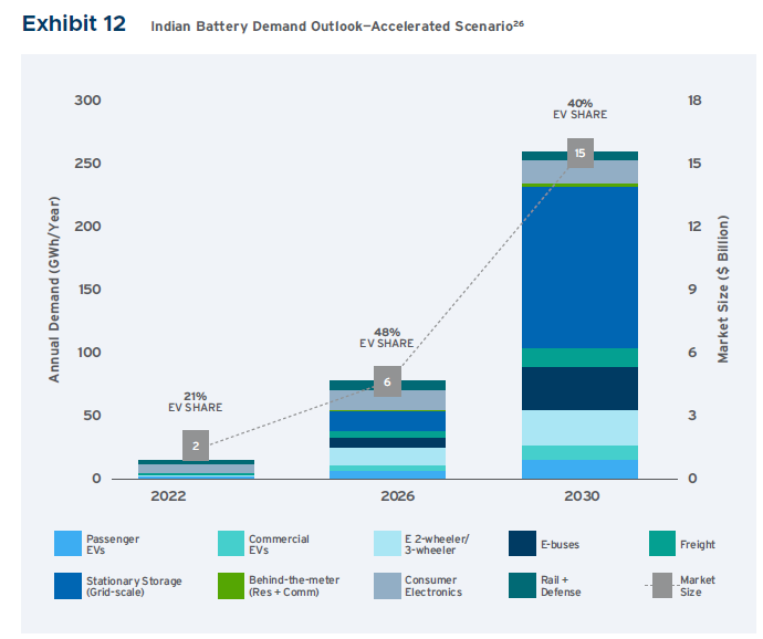 印度在先进电池技术制造方面的影响力如今微不足道。然而,该国拥有大规模电池制造的巨大潜力。报告指出,到2030年,印度的电池市场可能超过150亿美元(约合1.12万亿卢比),到2030年,印度的电池需求预计将在“加速情景”中上升到260GWh。