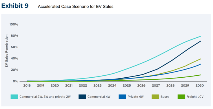 根据“加速情景”, 到2030年,电动汽车在新车销售中的细分市场渗透率将达到私家车的30%、商用车的70%、公交车的40%以及两轮和三轮车的80%。在“保守情景”中,预计2030年电动汽车在所有汽车细分市场的新销量中的加权平均渗透率为35%。