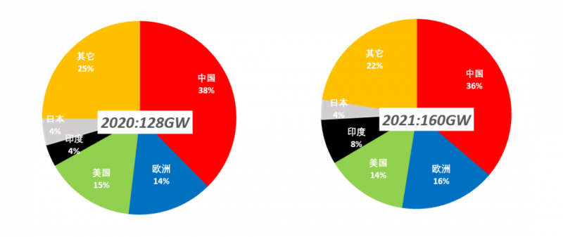 2021年光伏装机量的增长主要来源于几大传统太阳能市场:中国/美国/欧洲/印度