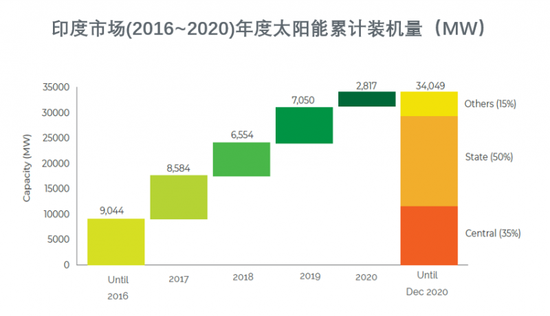 2020年,印度新增了约2.8 GW的公用事业规模太阳能装机容量和1.8 GW的屋顶太阳能容量,较2019年下降了65%
