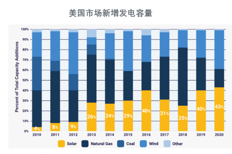 2020年,美国太阳能新增装机较2019年增长了43%,装机量达到了19.2GW,突破了历史记录