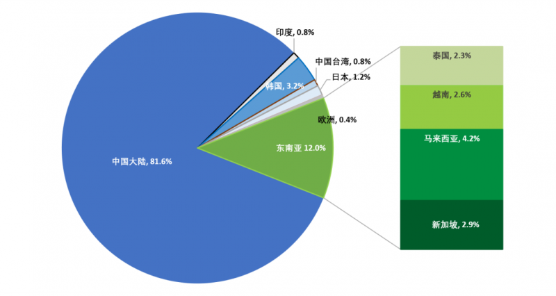 2021年2月,中国大陆市场的太阳能电池片产量占比稳定,仍然保持在80%以上