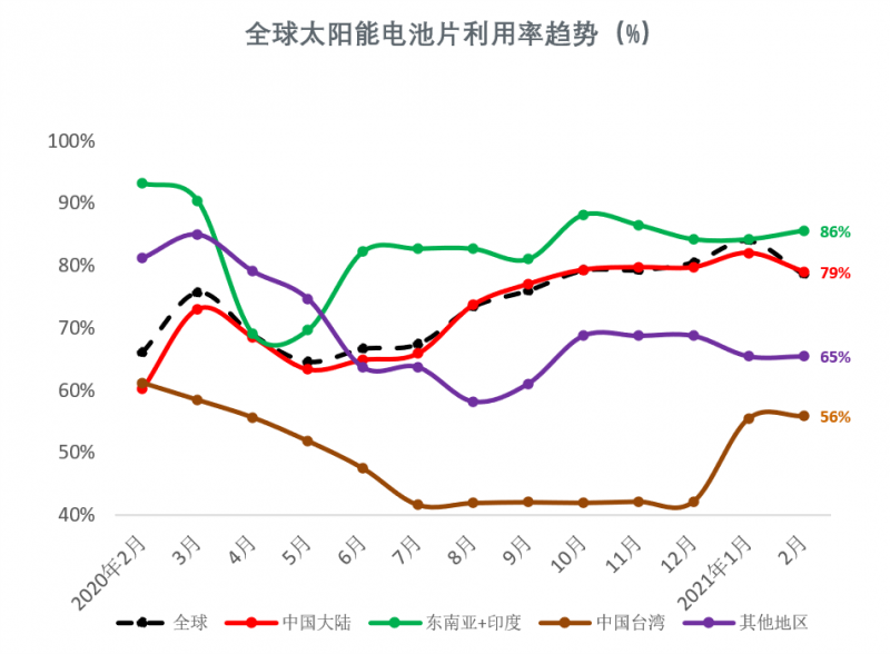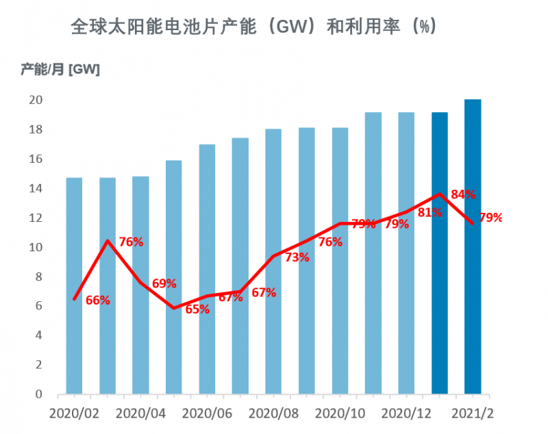 2021年2月,由于中国市场经历了春节假期,全球及中国大陆地区电池片产能利用率下降至79%