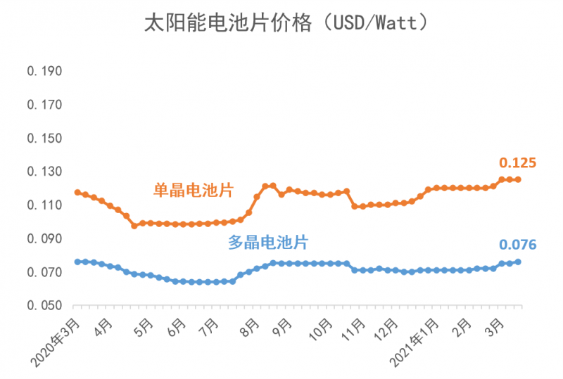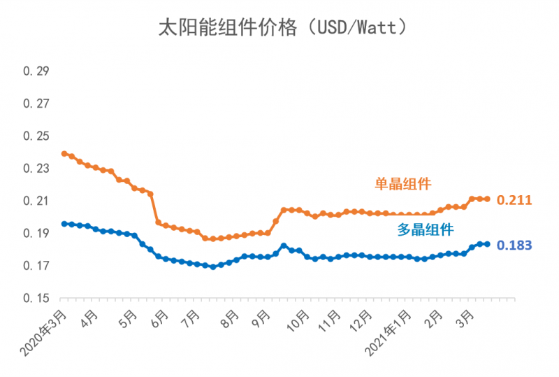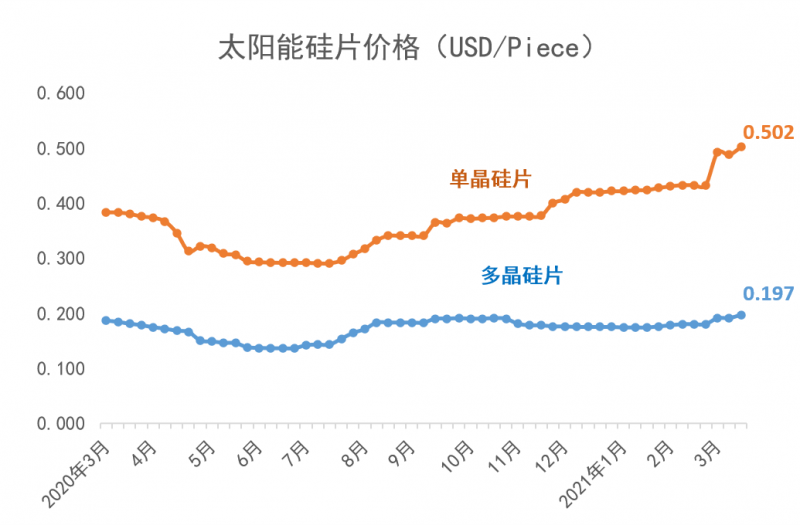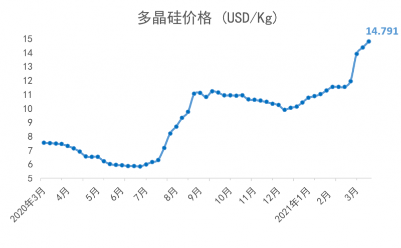 从2021年年初开始,多晶硅短缺的状况持续加剧。2021年3月,历经了传统的春节假期之后,上游多晶硅环节更加供不应求,目前的价格相比于2021年1月6日的价格已上涨了41%;同时,由于上游多晶用料呈现价格上涨,硅片端的价格同时跳涨。