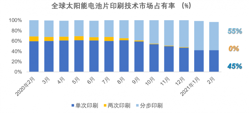 2021年1月,分步印刷技术的全球市场份额占比稳定,保持市场主流地位
