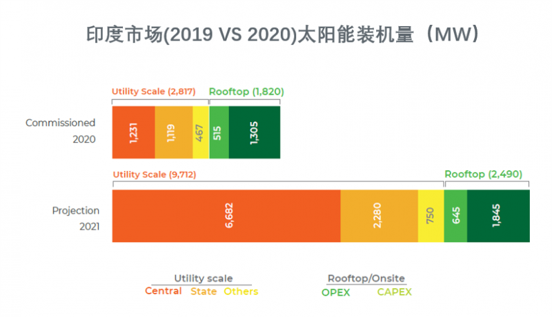 2021,印度市场预计将投产约9.7GW的新公用事业规模太阳能项目和2.5GW的屋顶/现场太阳能项目