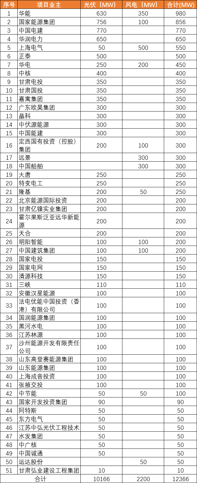从上表看出,TOP10业主中分布了央企发电企业、央企建设集团、民营光伏头部企业以及甘肃当地的国有企业等。作为五大发电集团之一的华能,大力进击新能源的步调是可以理解的。“双碳”目标提出以来,央企率先带头,华能集团提出了“十四五”期间全力打造新能源、核电、水电三大支撑,加快提升清洁能源比重,积极实施减煤减碳;并规划到2025年,发电装机达到3亿千瓦左右,新增新能源装机8000万千瓦以上,确保清洁能源装机占比50%以上;到2035年,发电装机突破5亿千瓦,清洁能源装机占比75%以上。