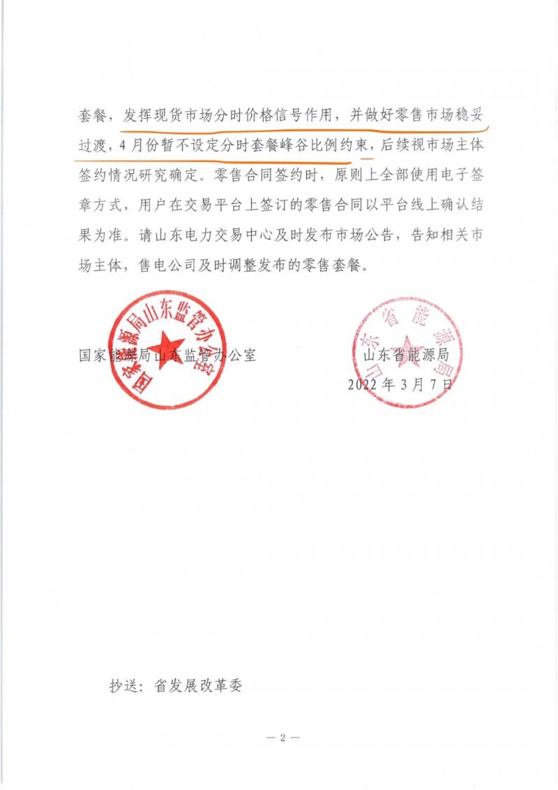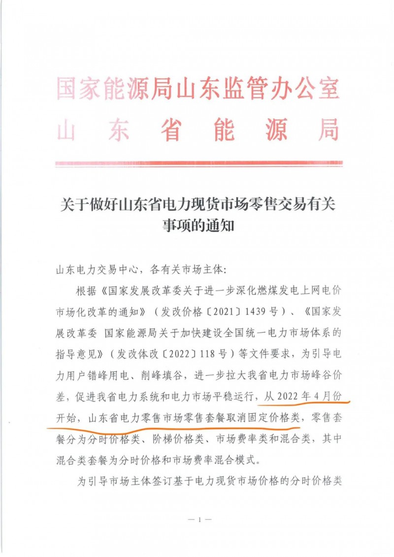 在此次交易公告发布之前,本月另一份文件的印发也相当重要:3月7日,山东政府发布《关于做好山东省电力现货市场零售交易有关事项的通知》,宣布从4月起,山东零售市场取消固定费率套餐,引导市场主体签订基于山东现货市场价格的分时价格类套餐。(下图)