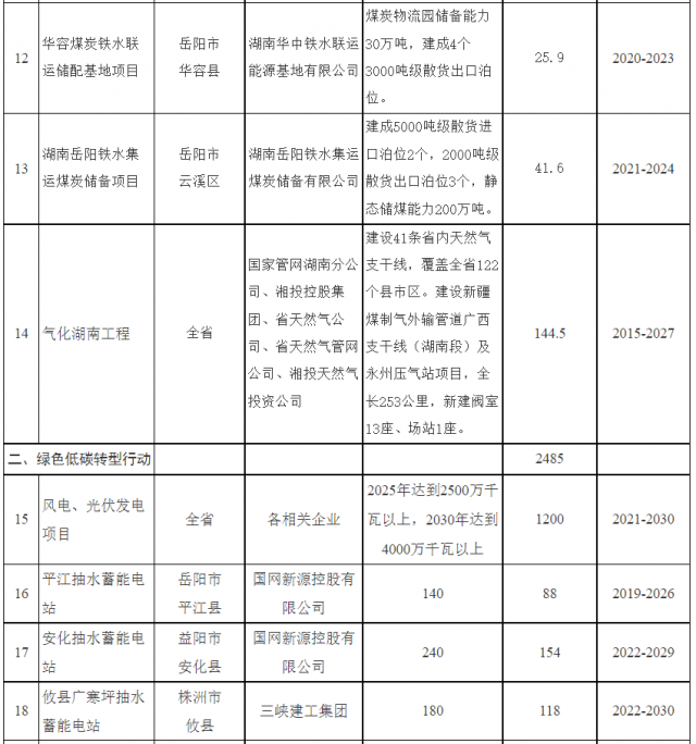 二、支撑电源建设工程。火电具有调节性强、可靠性高等优势,是满足经济社会发展用电需求、实现双碳目标的重要支撑电源。重点推进华电平江电厂,工程位于湖南省岳阳市平江县余坪镇,本期建设2×100万千瓦超超临界燃煤发电机组,同步建设超低排放环保设施,配套建设铁路专用线,总投资73.79亿元。2020年12月5日主体工程正式开工,确保2022年内正式投产。工程建成投产后,将为全省提供200万千瓦稳定供应能力,是打赢2022年迎峰度冬电力保供任务的重点工程。同时,加快国能岳阳电厂建设,争取2023年底前投产。积极推进长安益阳电厂、大唐华银株洲电厂、陕煤石门电厂3个煤电项目和湘投衡东燃气电厂、华电长沙燃气电厂、华能湘阴燃气电厂3个气电项目的前期工作,争取2022年内全部开工建设、“十四五”全部建成投产,确保2025年全省支撑性煤电和调峰性气电装机规模达到3300万千瓦左右。