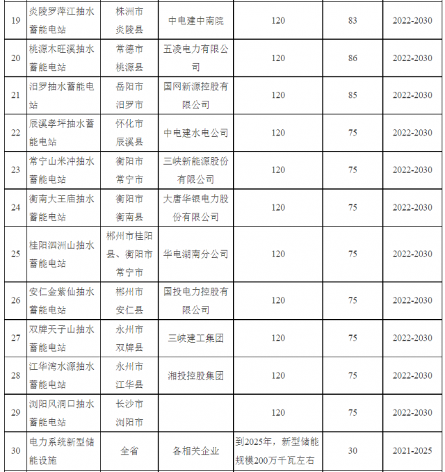 三、抽水蓄能规模化建设工程。抽水蓄能是当前技术最成熟、经济性最优、最具大规模开发条件的电力系统绿色低碳清洁灵活调节电源,加快发展抽水蓄能,是建设以新型能源为主体的电力支撑体系的内在要求。重点推进安化抽水蓄能电站,工程位于益阳市安化县仙溪镇,装机容量为240(8×30)万千瓦,总投资154亿元。目前,工程各项前期工作进展顺利,正按照2022年6月份完成项目核准并开工建设的目标加快推进,计划2029年建成投产。工程建成后,将大幅提升全省新能源的消纳能力。同时,加快平江抽水蓄能电站建设,争取2025年投产1台机组、2026年全部投产。积极推进已纳入国家抽水蓄能中长期规划,“十四五”重点实施的攸县广寒坪、炎陵罗萍江、桃源木旺溪、汨罗等12个抽水蓄能电站前期工作,力争2022年内全部核准启动建设,到2030年全省抽水蓄能装机达到2000万千瓦。