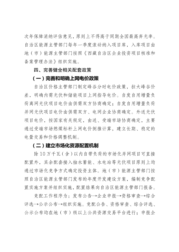 推进可再生能源利用示范区建设,提高电能在终端用能中的比例,加快新型储能建设,深度挖掘调度潜力。加强藏电外送力度,扩大区外市场消纳能力。推进存量和新增光伏电站配置储能、电网侧储能建设,积极协调电网企业、金融机构等部门,给予优先调度、绿色金融等激励政策,有效缓解全区弃光和局部限电的矛盾。